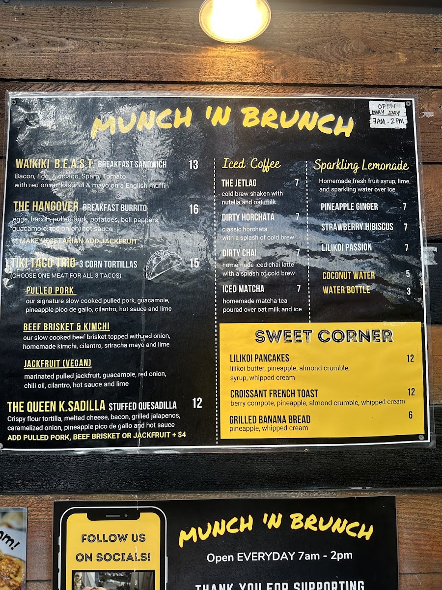 Satisfy your sweet tooth with Lilikoi Pancakes, adorned with homemade butter and fresh pineapple, a heavenly addition at $14.00. To wash it down, their refreshing Jetlag Cold Brew, infused with Nutella and oat milk, promises to awaken your spirits. With friendly service and a welcoming vibe, Munch 'N Brunch is truly a must-visit destination for food lovers.